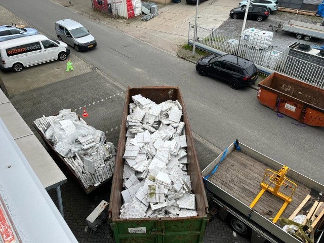 Polystyreen isolatie wordt gescheiden afgevoerd in containers en vind vervolgens zijn weg naar hergebruik.