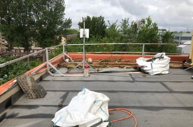Dakrenovatie ASVZ Hoogvliet. Het oude dakbedekkingssysteem met steenwol isolatie en p.v.c. dakbedekking wordt compleet vernieuwd door hoogwaardige PIR isolatie en een meerlaags bitumineus dakbedekkingssysteem. Tegelijk wordt ook de bliksembeveiligings-installatie vernieuwd.